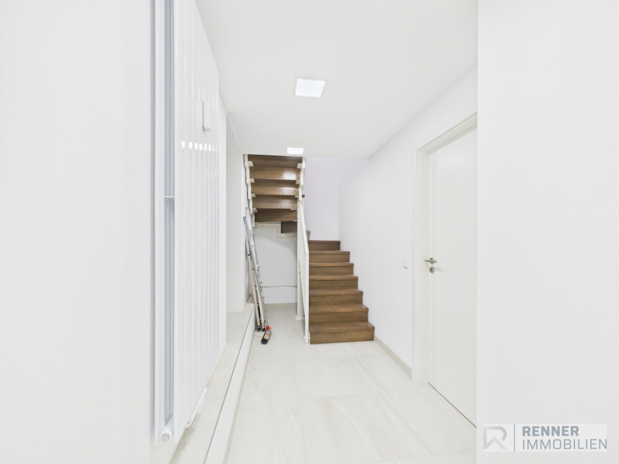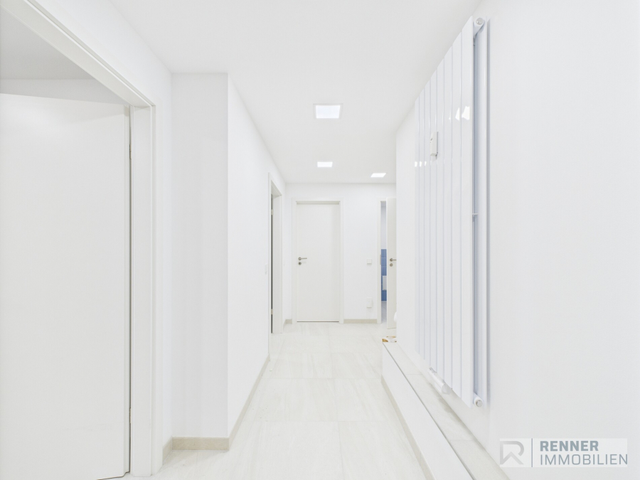 Der Eingangsbereich empfängt Besucher mit einer großzügigen, hellen Empfangs- und Wartezone, die dank der hohen Decken ein offenes, freundliches Raumgefühl vermittelt. Von hier aus erschließen sich mehrere separat zugängliche Behandlungs- bzw. Büroräume, die Privatsphäre und optimale Arbeitsbedingungen bieten. Die Räume sind durchweg lichtdurchflutet, was eine angenehme Atmosphäre schafft und das Wohlbefinden von Patienten, Kunden und Mitarbeitenden gleichermaßen steigert.