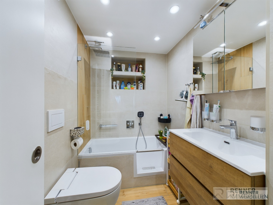 Ein komplett neues und barrierefreies Badezimmer mit Kombination aus Dusche und Badewanne im Erdgeschoss und ein Badezimmer mit WC und Dusche im 1.OG