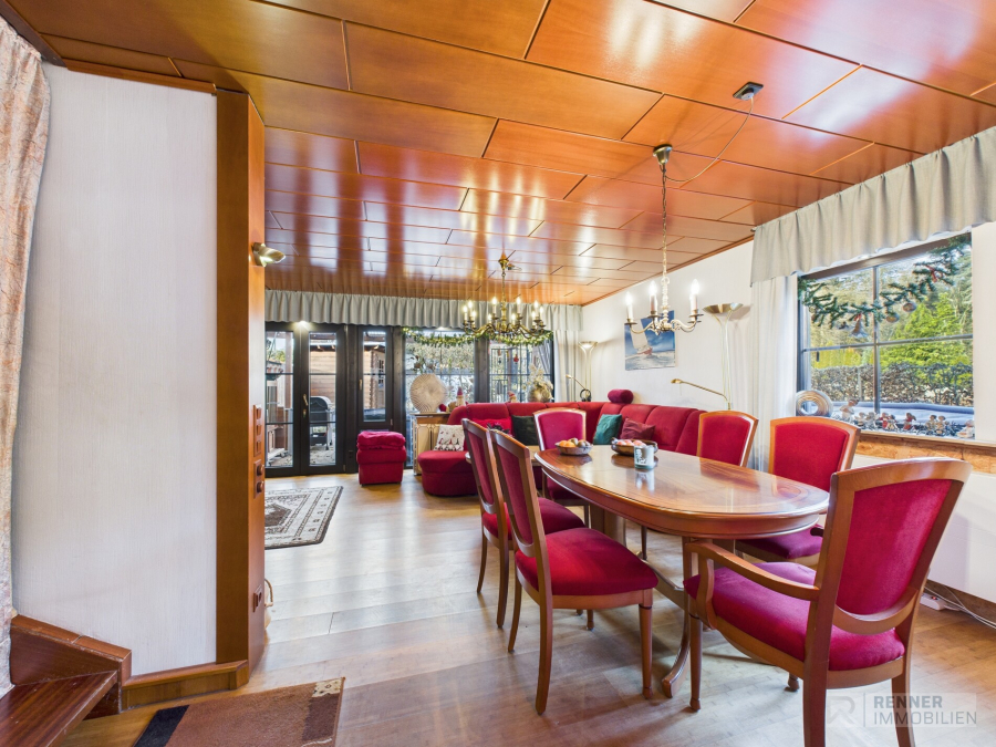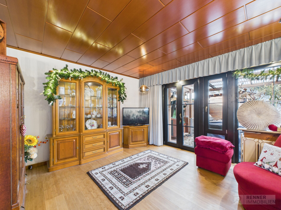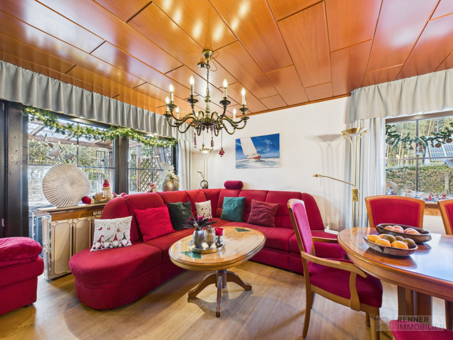 Ein besonderes Highlight ist der Wohnbereich mit direktem Zugang zum Garten, der gemeinsam mit der überdachten Terrasse einen hohen Wohn und Freizeitwert bietet. Hier entsteht eine angenehme Verbindung zwischen Innen und Außen, die sowohl an sonnigen Tagen als auch bei wechselnder Witterung genutzt werden kann. Das Gartenhaus ergänzt den Außenbereich sinnvoll und bietet zusätzlichen Platz für Geräte oder Freizeitaktivitäten.