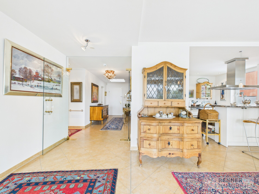 Das Herzstück des Penthouses bildet der weitläufige Wohn- und Essbereich, der sich wie eine Bühne für besondere Momente wahrnimmt. Hier verbinden sich modernes Design und warme Materialien zu einem harmonischen Gesamterlebnis. Eine elegante Einbauküche mit edlen Oberflächen fügt sich nahtlos in das offene Raumkonzept ein und unterstreicht den Anspruch an Stil und Funktionalität.