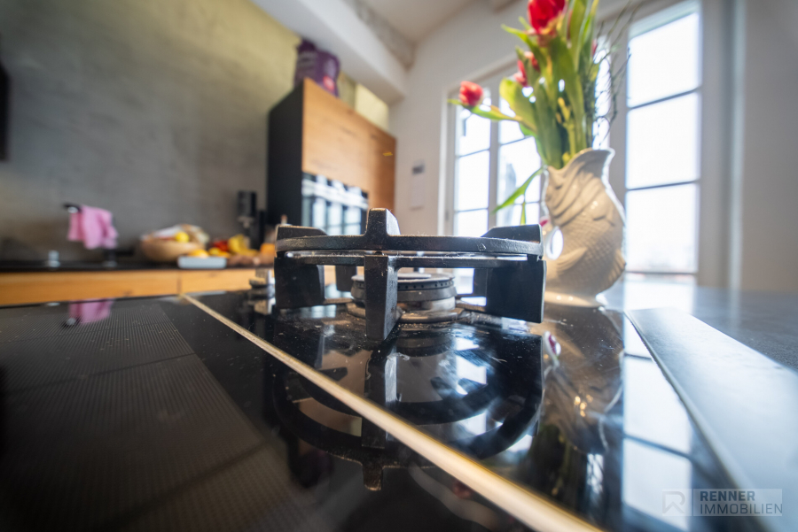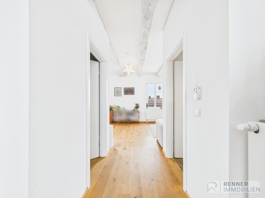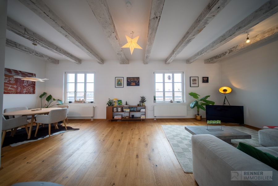 Das Herzstück der Wohnung bildet der weitläufige Wohn- und Kochbereich mit einer exklusiven Altholz-Einbauküche samt Kochinsel - ausgestattet mit Gas- und Elektroherd. Zwei luxuriöse Badezimmer sorgen für maximalen Wohnkomfort und verfügen zusätzlich über Fußbodenheizung. In einer Wohnung wie dieser darf eine stilvolle Ankleide nicht fehlen und wurde daher vom Schreiner passgenau eingearbeitet. Abgerundet wird der Innenraum durch ein lichtdurchflutetes Studio im Obergeschoss. Die Wohnung verfügt außerdem über Wandheizungen, welche für ein angenehmes Raumklima sorgen.